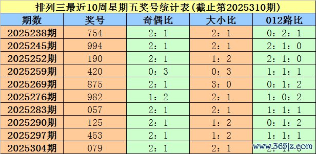 枚举三第2025304期(上周星期五)奖号为079。其中奖号奇偶比为2:1,大小比为2:1,012路比为2:1:0。