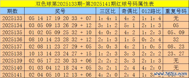 福彩双色球第2025141期奖号为:02 04 05 10 12 13 + 06,红球奇偶比为2:4,三区比为4:2:0,012路比为1:3:2,重号:04、12。